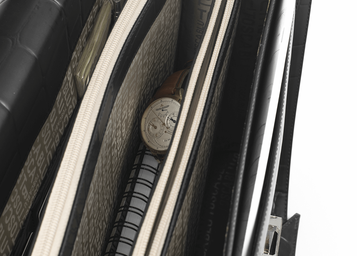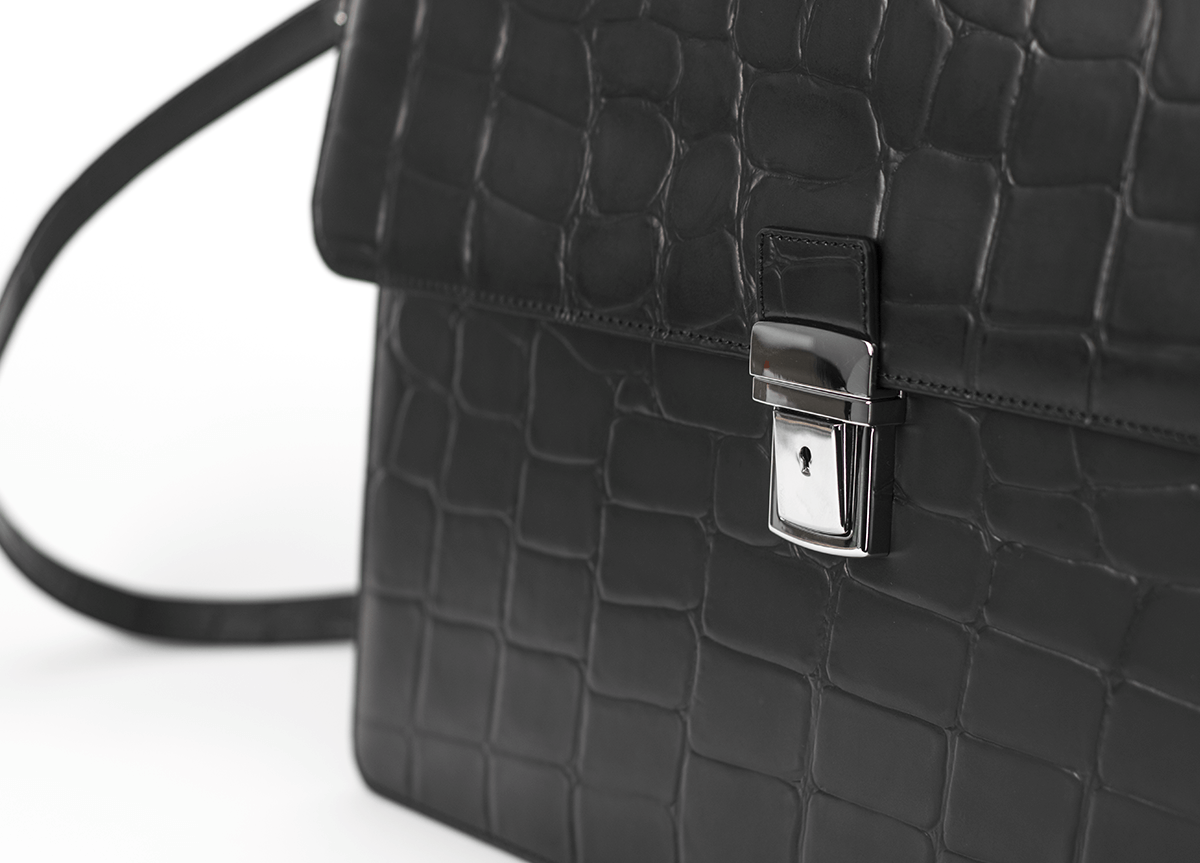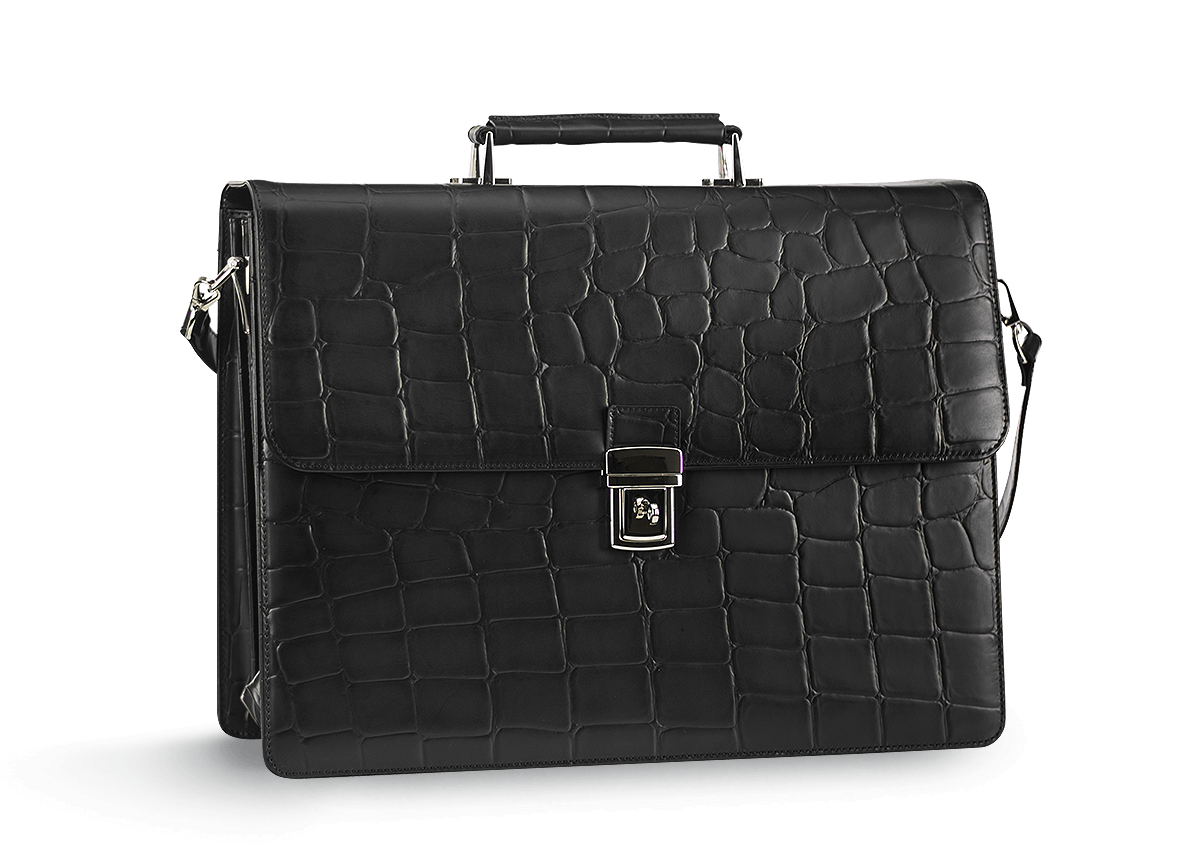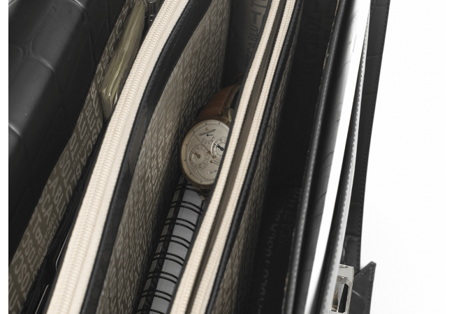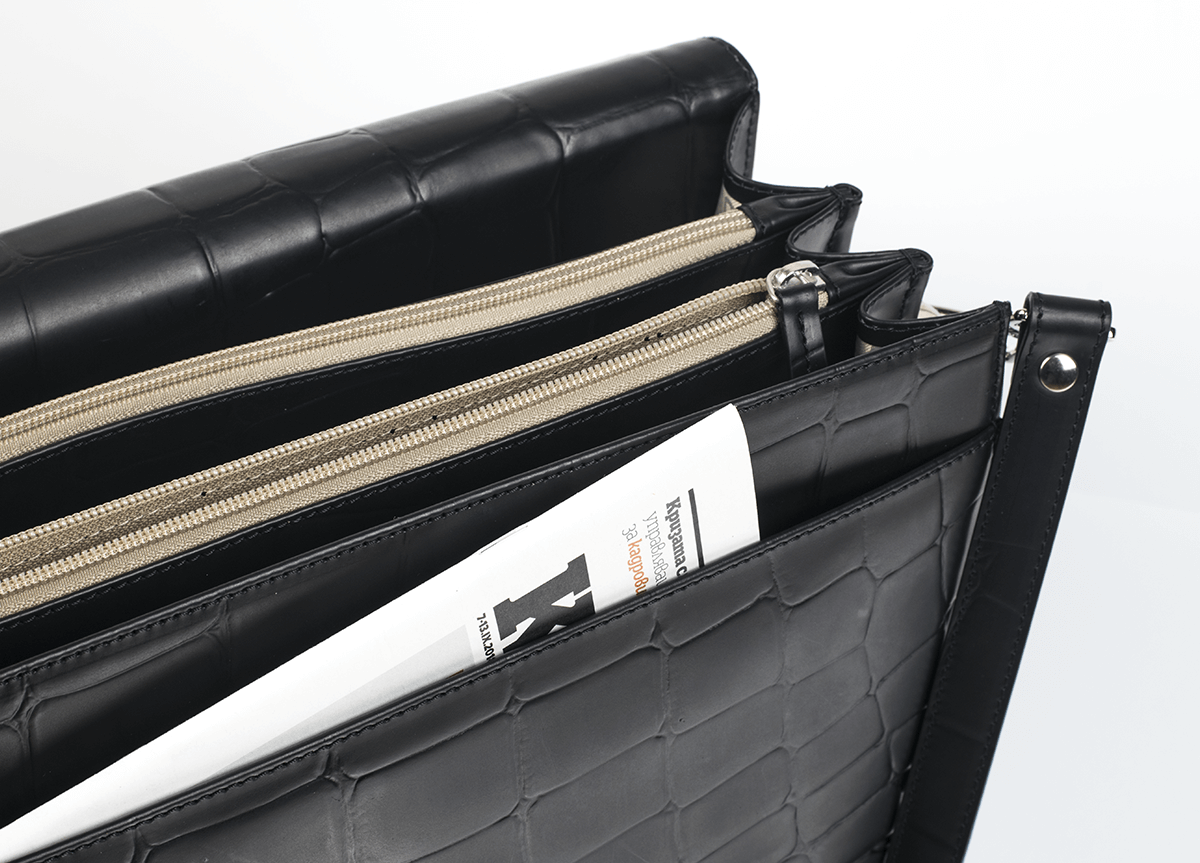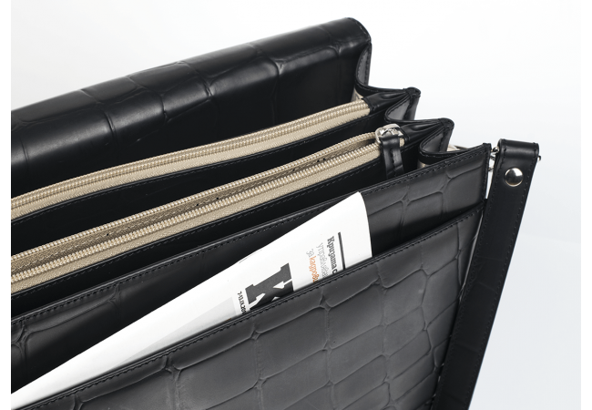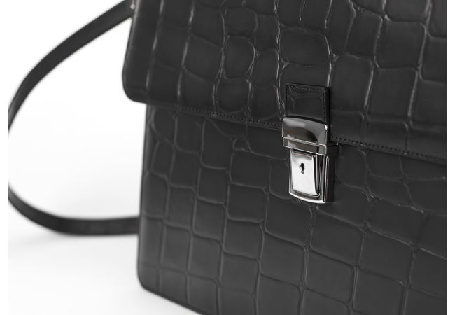 The bag has a clasp with key for better security. All important documents would be easily distributed inside bag’s interior, inside which there are three enclosures and two internal pockets with a zipper. Nine practical pockets for business cards as well as additional enclosure in the front part are at your disposal. The bag has a convenient short handle in its upper part, as well as adjustable long handle that you could put on or off, if necessary.